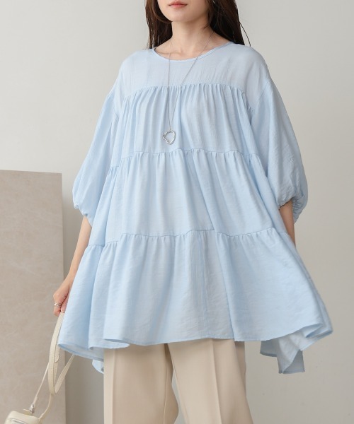 ●Bab●■POINT風になびくような軽い質感でふわっとしたシルエットが可愛らしいティアードチュニックの登場です。その日の気分によってお好きなネックラインでお召し頂ける前後2WAYで、タッセル付きの紐リボンも歩くたびに揺れ動き目を引きます。ヒップが完全に隠れる着丈も体型カバーが叶い嬉しいポイント。袖は肘まであるバルーンスリーブで二の腕をカバーしつつフェミニンさを際立たせます。楊柳生地で肌にあたる面積が少なく、蒸し暑い日でもさらっとお召し頂けます。■FABRICひんやりと清涼感のあるレーヨンと丈夫なナイロンの混紡です。■COORDINATEあえて緩めシルエットのボトムスを合わせることで今年らしい抜け感たっぷりのコーディネートに!可愛らしいデザインなので、モード見えのプリーツパンツやマニッシュなスラックス等すとんとしたシルエットと組み合わせると幼くならずに大人可愛い着こなしが出来ます。…………………透け感:あり裏地:なし…………………※撮影環境により、多少実際のカラーと異なる場合がございます。また、携帯やスマートフォン、パソコンなどの画面上と実物では多少色が異なって見える場合がございます。ご了承下さいませ。※画像の商品はサンプルのため、実際の商品と若干仕様が異なる場合がございます。※濃色品は、過度な摩擦や濡れた状態での摩擦により、色落ち・色移りをする恐れがあります。※この商品は、素材の特性上、洗濯の際に多少の縮みが生じる恐れがあります。洗濯後は形を整えてから干してください。※その他お取り扱いに関しましては、商品に付属のアテンションタグをご覧ください。★商品のお気に入り登録再入荷やラスト1点のお知らせ、セール情報などお知らせを受け取ることができます!★ブランドのお気に入り登録新商品や再入荷などのお得な情報を受け取ることができますので、是非ご登録ください。★Bab公式Instagramアカウント【bab.showroom】で最新情報をチェック!