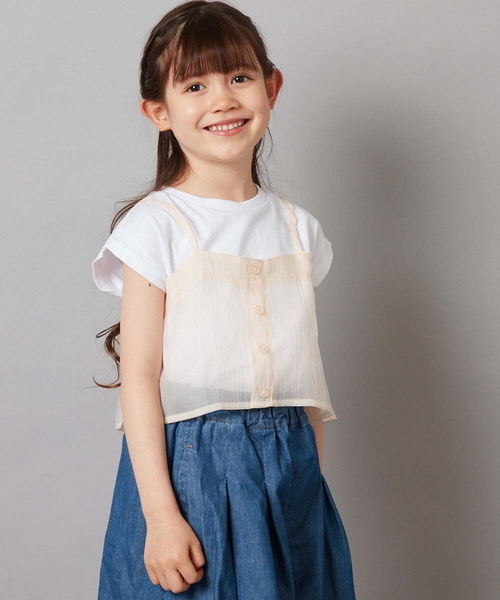 ◆今季トレンド!シアー素材が涼し気でおしゃれな重ね着風トップス◆ 【デザイン】 ・シンプルTシャツに、今季トレンドのシアー素材を使用したキャミソールをドッキング。 ・Tシャツとキャミソールは縫い付けてあり、通学シーンや公園遊びも着崩れせず快適。 ・フロントのボタンデザインがスタイリングにカジュアル感をプラス。 ・裾をウエストインしても、もたつかず、すっきり見えを叶えるきれいなシルエット。 ・真夏でも涼し気なフレンチスリーブデザイン。 ・クルーネックデザインで首元すっきり見え。 【素材】 ・Tシャツ部分…お肌にやさしいコットン100%素材。 ・キャミ部分…透け感のあるオーガンジー素材。 【スタイリング】 ・スタイリングに1点投入で、トレンド感をプラスしてくれる便利アイテム。 ・ワイドパンツあわせで大人っぽくおしゃれなスタイリングに。 ・ミニボトムとコーデして姉っぽカジュアルコーデに。 【カラー】 ・ライトブルー…さわやかさ№1!なライトブルー。 ・オレンジ…コーデに明るさをプラスする薄めのオレンジ。 ・ブラック…大人っぽくクールでかっこいい印象のブラック。 ---------------- 透け感:Tシャツ部分…なし、キャミ部分…あり 裏地:なし 伸縮性:Tシャツ部分…あり、キャミ部分…なし 光沢感:Tシャツ部分…なし、キャミ部分…ややあり 生地の厚さ:普通 ---------------- ≪お気に入り登録機能の使い方≫ ■商品のお気に入り登録(ハートマークをクリック) 再入荷通知や値下げ等、お得なご案内を受けることができます。 ※WEB・一部店舗限定販売です。 ※同じデザインの100サイズ/110サイズ/120サイズ/130サイズ/160サイズがございます。 100サイズ/110サイズ/120サイズ/130サイズ商品コード:KJKGV02024 160サイズ商品コード:KJKGX02034 ---------------- ※サンプルでの撮影となるため、実際にお届けする商品と仕様やサイズが異なる場合がございます。 ※商品画像は、光の当たり具合やパソコンなどの閲覧環境により実際の色味と異なって見える場合がございます。 商品の色味の目安は商品単体の画像をご参照ください。