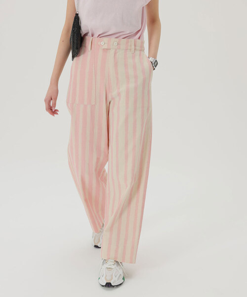 洗濯機使用可能/綿100%/ストレートシルエット/サイズ展開あり【2024SS】SLOBE citron./スローブ シトロン-FUNNY HUNT-2024Spring&Summer のスローガンは"楽しみ探し"ストリート、スポーツ、ミリタリー、ヨーロピアンの伝統要素を90'S/Y2Kスタイルに落とし込んだcitron.的冒険style。着る自分も、それを見ていてもおもわず微笑んでしまいそうなアイデアを盛り込んで、発見と楽しさ満載なCollection.2つの素材を組み合わせたリメイク風のデザインに仕上げたミリタリーパンツ。ペイント調のストライプ柄をcitron.らしくトレンドのピンクでおもいっきり遊びを効かせました!ベーシックなストレートシルエットをハイウエストデザインにすることで、女性らしいフォルムに仕上げました。シンプルなアイテムと合わせても、こなれ感のあるスタイリングが決まる着映えパンツです。※こちらの商品はWEB、札幌大丸店・ルミネエスト新宿店・Maison IENA(自由が丘店)・町田モディ店・ルミネ池袋店・ららぽーとTOKYO-BAY店・ベイクルーズストア名古屋店(PARCO)・ベイクルーズストア福岡店限定の商品です。※取り扱いについては、商品についている品質表示でご確認ください。※照明の関係により、実際よりも色味が違って見える場合があります。またパソコン・スマートフォンなどの環境により、若干製品と画像のカラーが異なる場合もございます。 ※商品の色味は、商品アップ画像をご参照ください。モデルサイズ:身長:164cm 着用サイズ:36本体:洗濯機洗い(弱)