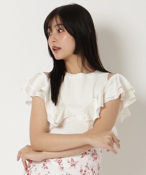 ノースリーブのニットトップスに、サテンフリルをレイヤードしました 微光沢のサテンを使用した、上品で落ち感のあるフリルは、大人っぽいフェミニンな雰囲気に。 身頃はニットで着心地が良く、フリルとのメリハリもついて良い感じに。 後ろのリボンでフリルの角度を調整できるので、肩あきも肩あきナシもどちらも楽しめます。 【styling】 肩のあきを調整できるので、肩あきナシなら通勤にもおすすめです。 仕事が終わったら肩あきにして、お出掛けを楽しんで! コーディネートしやすい形なので、ミニ丈ボトム、ロングスカート、パンツなどさまざまなボトムに合わせて着回しを楽しめます。 ※ホワイトは光の加減により少し透け感があるので、インナーの着用をおすすめします。 -------------------------- 透け感:(ホワイト)ややあり (ベージュ・ブラック)なし 裏地:なし 伸縮性:あり 生地の厚さ:普通 --------------------------- F:着丈47cm バスト64cm 肩幅26cm 袖丈12cm