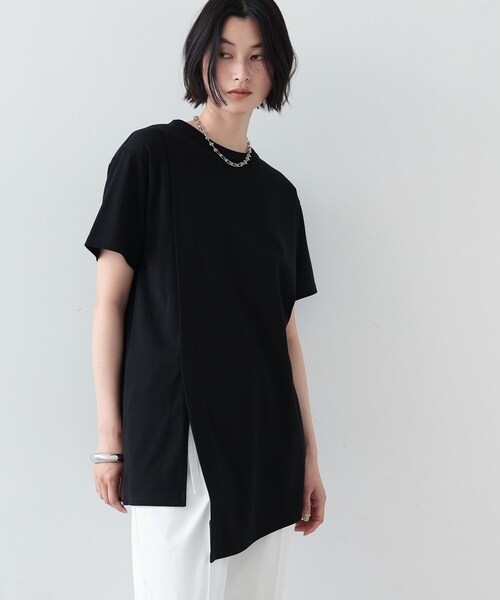 Design Point さっと着るだけでお洒落に決まる変形デザインTシャツ。 身頃をアシンメトリーに切り替え、大胆にスリットを入れたチュニック丈がポイントです。 さらっとした素材感で、真夏にも着心地良く快適に着ていただけます。 Styling Point ワイドパンツやバレルパンツと合わせてモードスタイルに。 Fabric Point 肌触りの良いさらりとしたタッチのコットン混のスムース素材。 ※照明の関係により、実際よりも色味が違って見える場合があります。また、パソコン・スマートフォンなどの環境により、若干製品と画像のカラーが異なる場合もございます。 店舗へのお問い合わせ商品番号:523-18051 ●製品寸法: 38(M):着丈72cm B104cm 袖丈19cm 肩幅45cm 備考: