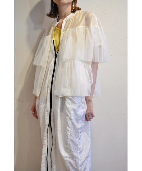 シアー感のある生地を使い、抜け感のあるスタイルを楽しめるブルゾン。 チュールがティアードになったデザインは空気感があり、とても春夏らしいアイテムです。 ダブルジップ仕様なのでコーディネートの幅も広がります。