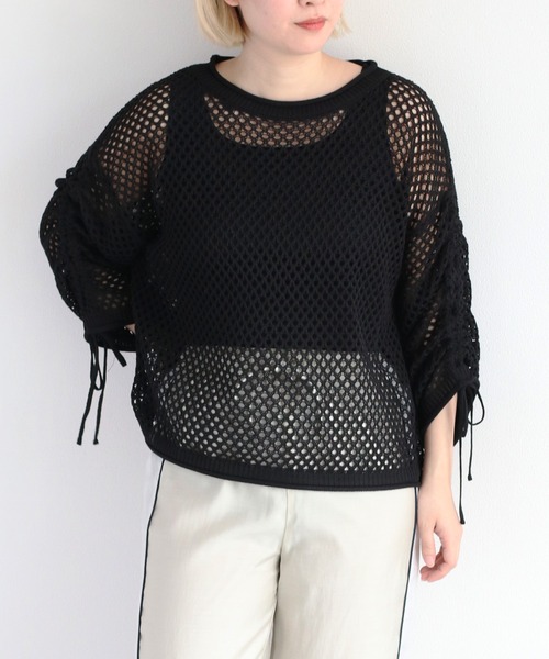 袖のドロストリボンがアクセント。 夏でも快適に着れる、新作メッシュニット♪ ◇Point◇ ゆったりな袖にギャザーデザインを施した今年らしいサマーニットです。 袖のリボンを絞ることでシルエットに変化をプラス。 着るだけで女性らしいスタイリングになります。 ◇Material◇ ハリのあるメッシュ素材のため、シルエットがきれいに見えます。 透け感のある素材で、着るだけで季節感溢れる一枚です。 ◇Coordinate◇ インナーにキャミソール、タンクトップで合わせるとヘルシーな雰囲気に。 透け感のあるトップスなので、インナーにロゴTシャツを合わせると ロングシーズンお使いいただけます。 ボトムスは上品にスカート、ワンピースで合わせるのもOK◎ デニムを合わせてカジュアルダウンにも最適です。 ※照明や天候により実際の色味と異なって見える場合がございます。ご了承くださいませ。