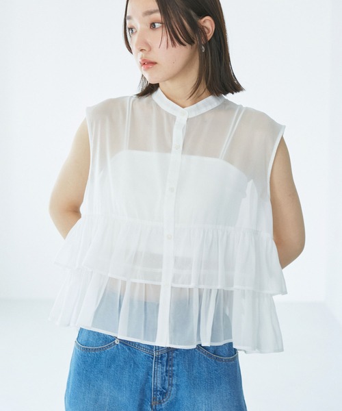 繊細な艶のあるシアーが印象的!主役級フリルブラウス◆2024春夏◆【デザイン・シルエット】2段フリルがポイントのノースリーブブラウス。ラメのような繊細な艶のあるシアー素材が今年らしく、レディな着こなしが叶います。 <POINT>・2段フリルは細かいギャザーを寄せ、存在感を持たせつつスタンドカラー。・ややフレンチの袖で幼い印象にならないようバランスに。・シェルのようなさりげないマーブルのきらめきがある釦もポイント!・美easyシリーズのパンツとの相性がよく、今年のパンツとの組み合わせを楽しめるような着丈設定。 【素材】柔らかく薄手なさらっとした素材感。洗濯機で洗えるのも嬉しいポイント。 【カラー】チャコール、ホワイト、ベージュ(ややオレンジ味あり)の3色展開。 【おすすめのスタイリング】VISおすすの美easyシリーズ(BVS34200,BVS34210)との合わせが◎特に美easyワイドパンツの新色ブラウンとオレンジベージュの組み合わせはおすすめします!他、デニムなどでジュアルにスタイリングしても◎通勤からお出かけまで幅広くご着用いただけるブラウスです。 ----------------------------- 裏地:なし 光沢感:あり 透け感:あり 伸縮性:なし ボタン:あり(開閉可) 生地の厚さ:薄手 季節:春、夏 ----------------------------- 【モデル着用サイズ】 全色モデル身長:160cm、着用サイズ:F<モデル着用インナー>BVF34060BVF34030 ※画像の商品はサンプルです。 実際の商品と仕様、加工、サイズが若干異なる場合がございます。 ※重量はサンプルFサイズの測量になります。サイズによって多少異なる場合があります。 ※画像によっては実際の色味と異なる場合があります。正しい色味は生地アップ画像をご確認ください。