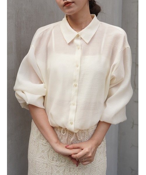 軽やかなシアー生地を使用した透け感のあるシャツ 裾にドロストが入っており、絞り具合によりシルエットを変化させることができるデザインに仕上げました。 シンプルながらもこなれた印象を与えてくれます。 しわになりにくく、さっと羽織れるので、夏の日焼けや冷房対策にもおすすめです。 シーンを問わず着用できるので、デイリーやオフィスでも活躍するアイテムです。 【付属品】 スペア釦10mm×1個 ーーーーーーーーーーーーーーーーーーー 【洗濯時の注意事項】 液温は40℃を限度とし、手洗いによる洗濯処理が可能です 漂白処理はできません タンブル乾燥は出来ません 日陰のつり干しがよい 底面温度110℃を限度とし、スチームなしでアイロン仕上げができます 石油系溶剤(蒸留温度150℃~210℃,引火点38℃~)での弱いドライクリーニング処理ができます 非常に弱い操作のウエットクリーニングができます ーーーーーーーーーーーーーーーーーーー ▼商品のお気に入り登録 お気に入りアイテムの再入荷や残り1点の通知を受け取ることが出来ます ▼ブランドのお気に入り登録 新作アイテムの入荷や人気アイテムの再入荷、 タイムセールやクーポンなど、いち早くブランドのお得な情報を受け取ることができます ーーーーーーーーーーーーーーーーーーー ※画像の商品はサンプルです。 ※商品を使用前に、タグ等に記載されている「取り扱い上の注意書き」、「洗濯表示」を必ずご確認ください。 ※商品画像は、光の当たり具合やパソコンなどの閲覧環境により、実際の色味と異なって見える場合がございます。 ※商品の色味は、スタジオ撮影の画像をご参照ください。 ※着丈は弊社寸法方法によりネックポイントから採寸しております。