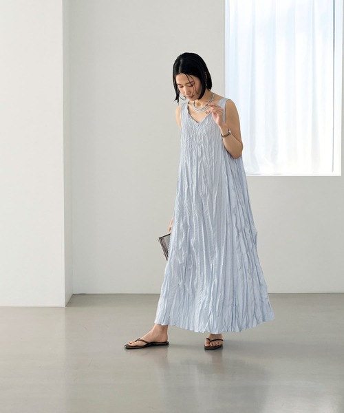 思いきりかけたシワ加工のランダムなシワシワ感が可愛い、Vネックのロングワンピース。この質感にこなれたオシャレさがあるため、とくに工夫をしなくても『着るだけで素敵』になれる一枚です。 生地はサラサラとした綿タッチの肌触りで、ポリエステル感はほぼ感じない、真夏のベタベタ肌にも気持ちの良い質感。裏地が無いので着心地も涼しく、真夏のオシャレ着にピッタリです。 生地自体の伸縮性はほとんどありませんが、大量の生地をギュッと縮めてシワにしているため、そのぶんかなり伸びる!という特殊な伸縮性あり。凹凸がしっかりとあるので肉感を拾わず、体型カバー効果も高いワンピースです。 ◆リゾート感のある夏らしいワンピースですが、ジャケットやカーディガンを合わせると途端に上品になり、オフィスにもOKな大人っぽさが出るのが秀逸。まさにオンオフ両用の『使える』実力派ワンピースです。 ◆カジュアルに着たくて羽織りが必要な場合は、麻シャツやナイロン系の薄手ブルゾン合わせなど、『きちんと感が無い質感』のものを合わせるのがお薦めです。 ◆ゆったりとした着心地。身体のラインを出さずにラクな着心地が叶いつつ、シワ加工のテンションにより大きなシルエットにはならないところが特徴です。 ◆基本的にはくるぶしくらいの長めな丈感を想定していますが、もっとしっかり脚を出した短い丈感で着ても素敵です。どんな丈感で着ても可愛いデザインになっています。 ◆下着の肩紐は骨格に合わせて位置を調節すれば隠すことができますが、黒などの見えても下着感の無いお色であれば、肩紐が出ててもぜんぜんアリだと思います。※隠しても動くと見えたりはします。 ◆生地にしっかりとした凹凸があり、ハリ感もあるため、ペチコートは無しでもキレイに着れます。 ◆オシャレ着として手洗いをしていただければ、シワ加工が取れることはありません。洗濯機でラフに洗うと、デザインが変わってしまう恐れがありますのでご注意ください。 【商品の特徴】 ◆着用時期:春夏メイン ◆サイズ感:ゆとりのあるサイズ感 ◆丈感:足首が見える程度の丈感 ◆シルエット:Iラインシルエット ◆タック:なし ◆スリット:なし ◆厚み:やや薄手だが安心感のある厚み ◆柔らかさ:柔らかさの中にハリ感あり ◆着用ジワ:できにくい ◆毛羽立ち:できにくい ◆伸縮性:微ストレッチ有り ◆光沢感:なし ◆透け感:なし ◆ボタン:なし ◆ファスナー:なし ◆ベルトループ:なし ◆肩紐調節:なし ◆ポケット:両サイドポケットあり ◆裏地:なし ◆手洗い:可能 ◆裾上げ:可能 ◆アイロン:可能(低アイロン) 【お色について】 ◆パパイヤ:熟したパパイヤのような、深みのあるオレンジ系カラー。 ◆アクアブルー:明度を上げて明るい印象に仕上げた爽やかなブルー。 ※商品コメントの内容はブランドプロデューサーによる説明文です。