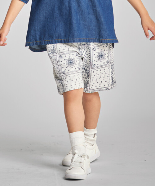 《デザイン》 夏にぴったりなバンダナ柄を総柄でプリントしたハーフパンツです。 全体をオートミールやネイビーのすっきりとしたカラーでまとめて、 おしゃれで大人っぽい印象に仕上げています。 ジャージー素材なので穿き心地良く、 動きやすさがありますので、 男の子女の子問わず着て頂けます。 お子様一人でも着脱しやすいオールゴム仕様で、 内側に調整口があります。 単調になりがちな春夏のコーディネートのアクセントにもなるカジュアルな一枚です。 《リンクコーデ》 下記品番とリンクコーデとしてお召しいただけます。 ・ベビーサイズ(品番:23-49PG05-204) ※在庫がない場合もございますので、予めご了承くださいませ。 《素材》 柔らかで、裏毛よりもループの浮きが少なく、 厚みが抑えられたすっきりとしたインレイ素材にバンダナ柄を総柄でプリントしています。 ポリエステルが高混率に入ることで、通気性・吸水性に優れ、 サラッとした肌触りで夏も快適に着て頂けます。 ご家庭でお洗濯洗い可能です。 ※画像の商品はサンプルとなりますので実際の商品と仕様、加工、サイズが若干異なる場合がございます。 ※こちらの商品はFIVE FOXes独自の採寸方法となっています。 本サイトのサイズガイドと採寸方法が異なる場合がありますのでご了承ください。