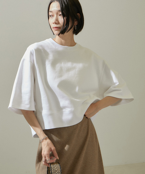 スッキリとしたショート丈と程よいワイドシルエットがバランスよく決まる、フォルム感にこだわった半袖スウェットTシャツ■デザイン/シルエット クロップド丈が今の気分にぴったりなスウェットTシャツです。 パンツ、スカートにも合わせやすいバランスの良い丈感にこだわりました。 後ろの着丈は前よりも長めにしているので、ヒップが気になる方にもオススメ。 前はスッキリとさせたことでスタイルアップ効果があり、後ろは体型カバーしてくれる優秀な1枚です。 クロップド丈と相性の良い程よいゆとりのあるワイドシルエットとバックスタイルのフォルムがポイントです。 袖丈は少し長めで肘が隠れる、大人の女性に嬉しい丈感にこだわりました。 広めの袖口にしているので通気性もよく、暑い時期も快適に着用いただけます。 合わせやすい定番のオフ、ブラックの2色展開です。 ■素材 ハイゲージで編立てシルケット加工を施すことにより、落ち着きのある光沢とハリ感のある上品な表面感が特徴の裏毛素材です。 分厚すぎないほどよい肉感でさらりと着用いただけます。 ご自宅でお洗濯可能/マシンウォッシャブルなのも嬉しいポイント。 ■コーディネート ナロースカート、スタイルアップパンツ、スタイルアップスカートなど、 ストレートライン/Iラインのボトムとのスタイリングがバランスよく決まりオススメです。 デニムとカジュアルにまとめたり、ツヤ感のある素材と合わせたMIXスタイルも素敵です。 袖口をロールアップしても◎ ■モデル身長:166cm 着用サイズ:F ----------------------------- 裏地:なし 光沢感:なし 透け感:なし 伸縮性:なし 生地の厚さ:やや厚手 -----------------------------
