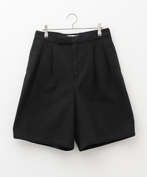 M24B-05PT01B ブラック(001):BLACK BEIGE(027):BEIGE marka では定番の「OFFICER PANTS 2TUCK WIDE」をショートパンツにアレンジしました。パレードや祭事などで着用する準礼服としてイギリス陸軍に採用されていた、バラックドレスパンツのサイドアジャスター仕様を踏襲し、フロントには2タックを入れることでワイドなシルエットにしています。ベルトループをなくしたことで、タックインしたときの見え方をスッキリとさせています。股上は深めで、ハイウェストでの着用もおすすめです。タックインしたときに魅力が最大限活かされるワイドショーツ。ベルトループをなくした斬新なデザインで、トップスをインしたときの見え方にちょっとした新鮮さをもたらします。腰についたアジャスターでウェストのサイズは調整可能。ベルトを通せないという心配もいりません。元々ドレス用に製作されたパンツをベースにしているので、カジュアル感のある素材を使用していますが、どこか上品さも垣間見える一本です。 【MARKA / マーカ】 由来:1.[karma](カルマ(業))のアナグラム、2.[mark]と[a]という二つの英単語の組み合わせにし、その名前に様々な意味を含ませるようにした。読みは仏教用語として日本に残る古サンスクリット語に由来。英語の「great」とほぼ同意味。 コンセプト:"real man's garment" 真の男性の為の洋服づくり。1.ガーメント発想でそれぞれのアイテムの作り込みを行う。 2.60年代~70年代のカウンターカルチャーをベースにした、現在は失われてしまった男性像の追求。 モデルサイズ:身長:180cm 着用サイズ:2 本体:洗濯機洗い(弱)
