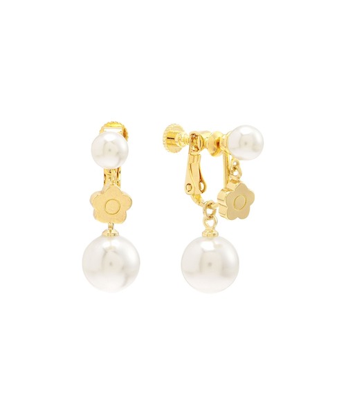 パールをメインにした華やかな雰囲気のシリーズ。 ◆シリーズ共通ポイント ・アクセントに効かせたメタルデイジー ◆カラー展開 ・ホワイト ◆アイテム紹介(イヤリング) ・挟む強さを調節できるネジバネ式 ◆コーディネート デイジーの下でパールが揺れ、コーディネートに華やかさをプラスします。