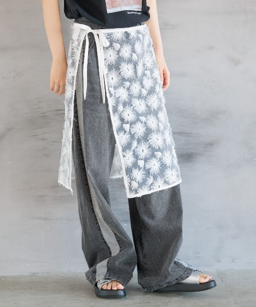 スタイリングのアクセントになる巻きスカートはリボン仕様で着脱しやすい1枚。透け感のある繊細な素材に刺繍とスパンコールをあしらったデザインもポイントに。スパンコール使いでも同色デザインで派手になりすぎず、さりげなく華やかさを加えてくれます。【スタイリング】シンプルなアイテムとのスタイリングがおすすめ。合わせるだけでスタイリングを旬にしてくれるアイテムです。