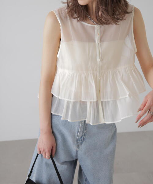 〔fabric&design〕透け感のあるオーガンジー素材で、ティアードのフリルがふんわり出てくれる特徴を生かし、2段フリルをあしらいました。襟ぐりと前立ては透けない別布を使用しています。インナーにベーシックなカップ付きインナーキャミなどを合わせての着用をおススメします。〔styling〕ブラウスとしても、ベストのようにレイヤードさせてもお使いいただけます。ショート丈でバランスが取りやすいのでボトムスはスカートからパンツまで合わせやすく、スタイルアップして魅せてくれます。■透け感:あり■生地の厚さ:薄手■裏地:なし■伸縮性:なし■光沢:ややあり■シルエット:スタンダード---------------------------------------------------◆商品のお気に入り登録◆お気に入りアイテムの値下げ・再入荷・在庫1点などの通知を受け取ることができます。◆ブランドのお気に入り登録◆新商品や再入荷、セール、クーポン配布などお得な情報を受け取ることができます。---------------------------------------------------※ご注文いただいた予約商品のお届け時期の確認は、注文履歴ページより行えます。