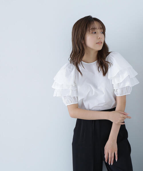 <オフィスカジュアル・デイリーにおすすめ> 袖のボリューミーなラッフルフリルがポイントのブラウスは、全体的にメリハリが出るよう身頃をコンパクトシルエットに仕上げています。袖下はすっきりと切り替えを入れ、着心地が良い仕様に。ウエストインで袖のボリュームを引き立てながら、オンにもオフにも着まわせます。 <素材> 軽いハリ感のある素材を使用。 <詳細> 仕様・後ろボタン 裏地・なし 透け感・あり / 光沢・ややあり / 伸縮性・なし 生地の厚さ・薄手 ※モデルの着用画像の場合、光の当たり具合により、実際の色味と異なって見えることがございます。色味は、商品単体の画像をご参照ください。 【ZOZOでのお買い物をもっと楽しむために!】 ■ブランド・ショップのお気に入り登録 ・いち早く新作アイテムや限定クーポンなどのお得な情報を受け取ることができます! ■商品のお気に入り登録 ・完売商品の再入荷通知や、残り1点の通知、各種セール通知も受け取ることができ、よりお得にお買い物頂けるチャンスがあります!