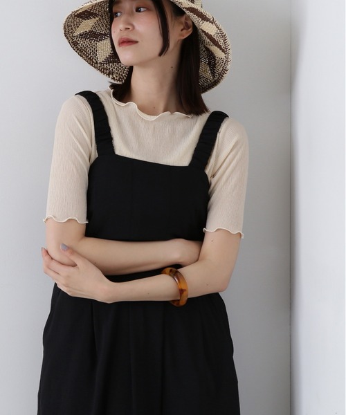 大人見えするシュリンクカットソーです。部分的にフリルのようなメロウ加工が入っており、フェミニンな雰囲気に見せてくれます。やや透ける素材なので、お持ちのインナーを合わせていただくのがオススメ。ワイドボトムにウエストインしてすっきりまとめたり、ジャンスカインをするとレイヤードスタイルも楽しめます。**********************透け感:なし裏地:なし伸縮性:ややあり光沢感:なし生地の厚さ:普通**********************●取り扱いについては、商品についている品質表示でご確認ください。●撮影はサンプル商品で行っている為、仕様とサイズが異なる場合がございます。●スタジオ及び屋外で撮影した着用画像は、光の当たり具合やご覧のモニターによって色味が違って見える場合があります。予めご了承ください。●生産時期により色・素材・サイズ感など多少異なる場合がございます。予めご了承ください。≪お買い物をよりお楽しみいただくために≫・「商品のお気に入り登録」再入荷通知や、ラストの通知、セール通知も受け取ることができます。・「ブランドのお気に入り登録」新商品や再入荷など、お得な情報を受け取ることができます。