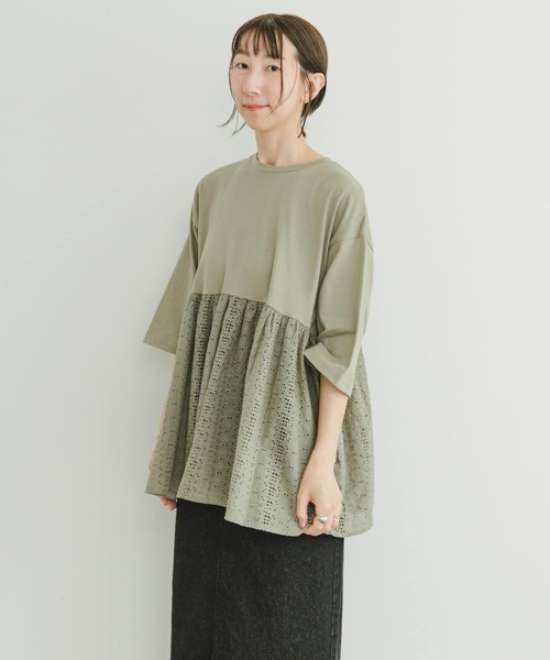 シンプルなハーフスリーブのTシャツと透け感を抑えたレースをドッキングさせた人気の切り替えデザインがポイントの1着。ゆったりとしたシルエットでストレスフリーな着心地が魅力◎デニムを合わせてとことんカジュアルなスタイリングから、キレイめのボトムを合わせた落ち着いたコーディネートまで、幅広く着回せるアイテムです。 【2024 Spring/Summer】【24SS】 ※この商品は、着用時にベルト・バッグ・アクセサリー・周辺の壁など、表面の粗いものとの摩擦や、引っ掛かりにご注意ください。 ※刺繍部分は、引っ掛け・引っかかりやすい性質をもっておりますので、着脱時には十分ご注意ください。 ※その他お取り扱いに関しましては、商品に付属のアテンションタグをご覧ください。 ※商品画像は、光の当たり具合やパソコンなどの閲覧環境により、実際の色味と異なって見える場合がございます。予めご了承ください。 ※商品の色味の目安は、商品単体の画像をご参照ください。 ▼お気に入り登録のおすすめ▼ お気に入り登録商品は、マイページにて現在の価格情報や在庫状況の確認が可能です。 お買い物リストの管理に是非ご利用下さい。 素材感 透け感 : ややあり(WHTのみ) 伸縮性 : ややあり 裏地 : なし 光沢 : なし ポケット : なし