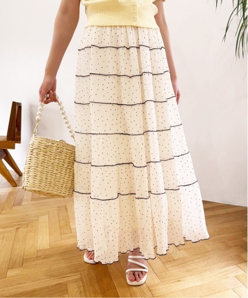~NICECLAUP 2024 Summer Collection~ 歩くたびに揺れる裾がおしゃれなティアードスカート すっきりとしたIラインシルエットでガーリーすぎず、大人なコーディネートに。 柔らかな生地感のプリーツで印象も柔らかく、ウエストもゴム仕様で着脱も楽ちん。 合わせるトップス次第で、カジュアルからガーリーまで幅広くお使いいただけます。 裏地をやや短くお作りしているので程良いシアー感を楽しんでいただけます。 ■オススメスタイリング オーバーサイズのトップスと合わせて大人カジュアルコーデに◎ コンパクトTやカーディガンと合わせるとIラインを活かした 大人ガーリーコーデにもなります。 ------------- 裏地::アイボリー、サックスのみペチコート付き 伸縮性:あり 生地の厚さ:普通 生地の重さ:普通 洗濯 :手洗い/ドライ ------------- ※サンプルでの撮影のため、実際のものと仕様や色が異なる場合があります。 ※室内、室外での撮影のため実際より明るく映っていたり、暗く映っていたりする場合がございます。 ※品質表示を必ずご確認下さい。 【商品のお気に入り登録】 完売カラーの再入荷や、ラスト1点のお知らせ、セールの通知を受け取ることができます。 【ブランドのお気に入り登録】 新作入荷や再入荷情報など、ブランドの情報をいち早くお届けします。 ぜひご登録ください♪