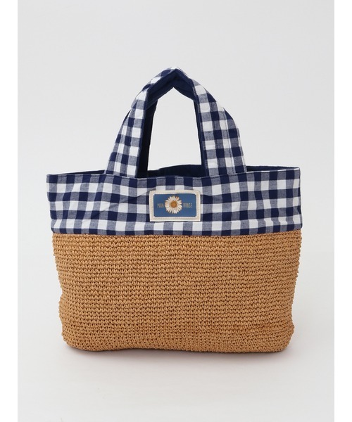 夏らしい季節感を感じられる軽やかなペーパーヤーンを編み込んだ可愛らしいバッグ。 横長長方形のトートタイプのバッグは、ちょっぴりマチもあるタイプ。大柄のブロックチェックにひな菊ネームワッペンを添えてピンクハウスらしく仕上げています。 軽いペーパーヤーンをコマ編みという細やかな編み方で編んでいます。あまり重たいものを入れてしまうと型崩れしてしまう恐れがあるのでご注意ください。コーディネイトを夏らしくするアイテムという位置づけお使いいただけますように。内ポケットもしっかり付いています。