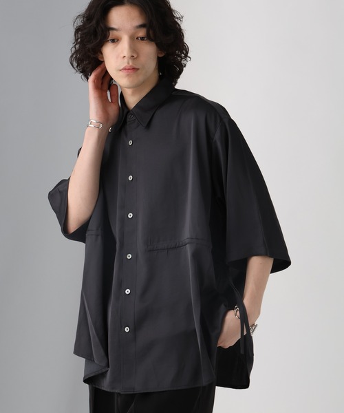 ーーー光沢感あるサテン生地を使用したデザインシャツが登場ーーーpoint□表面感のきれいなサテン生地を使用したデザインシャツ。□光沢感があり主張を抑えつつも色気のあるアイテム。□裾部分向かって広がる落ち感のあるシルエットが特徴的なシャツ。□裾に入れ込んだドロストデザインで絞って着用ができ、シルエットの変化を楽しめます。