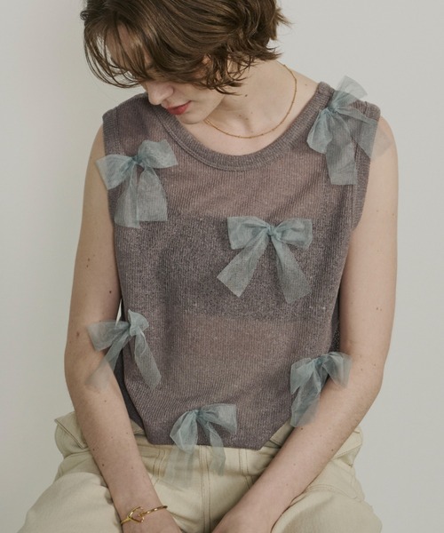 【desing】 トレンドライクなチュール素材のリボンモチーフを 大胆にあしらったデザインがポイント 本体は程よい透け感のシアー素材で、夏らしいスタイリングにぴったりの1枚 バックオープンのデザインで後ろ姿まで抜かりないアイテム。 【styling】 リボンモチーフがかわいらしいアイテムのため デニムやスラックスなどカジュアルなアイテムと組み合わせるとバランスが◎ ※素材の特製上引っ掛かりやすいため、取り扱いにはご注意くださいませ。 〈公式Instagram〉 @unitage__official ※商品の写真はサンプル品を撮影しておりますため 実際の商品とは仕様や加工、サイズ等が若干異なる場合もございます。 ※屋外の光や照明の当たり具合で、実際の商品の色味とカラー別画像の色味に若干の違いが発生する場合がございます。 詳細画像と併せてご確認の上、ご注文いただきますようお願い致します。 ------------------------ 透け感/あり 光沢感/なし 伸縮性/あり 裏 地/なし ------------------------ ※自宅洗濯可能(手洗い) 詳細は商品タグをご確認ください。