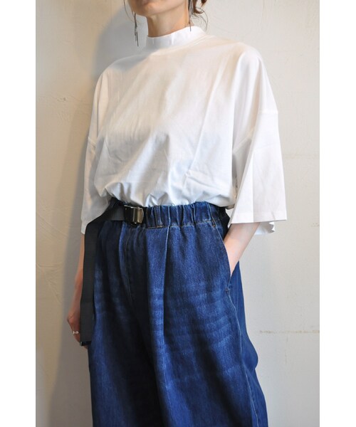 程よいハイネックにオーバーサイズのビッグTシャツ。 袖の長さも充分にあり、ユニセックスでお勧めです。 着用したときに立体パターンの良さを感じられるトップスです。