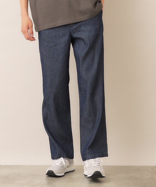 【デザインポイント】綿麻デニムを使用したロングパンツ。ウエストゴムでワイド目なシルエットです。後ろポケットのDN刺繍がポイント。※ポケット数:横×2 後ろ×2【スタイリングポイント】シンプルにTシャツやシャツとのスタイリングがおすすめです。同素材のシャツとのセットアップも可能です。【素材ポイント】麻混のデニムで夏場でもはきやすい清涼感のあるデニム生地です。※裏地なし※照明の関係により、実際よりも色味が違って見える場合があります。また、パソコン・スマートフォンなどの環境により、若干製品と画像のカラーが異なる場合もございます。モデル情報:身長185cm B81 W68 H90 着用サイズ:02(M)店舗へのお問い合わせ商品番号:F59-69303●製品寸法:02(M):W~82cm H94cm 股下73cm 前股上30cm 渡り幅31cm 裾幅22cm03(L):W~88cm H98cm 股下73cm 前股上30cm 渡り幅33cm 裾幅32cm備考: