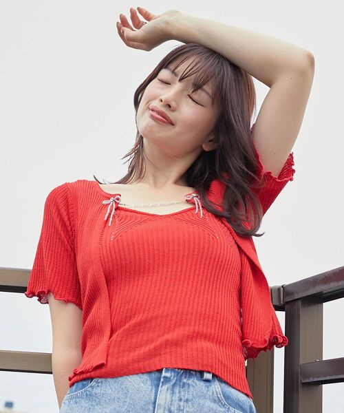 ビーズリボンが今の気分にぴったり。半袖カーデとキャミソールのセットアイテムが登場!■デザイン涼しげな印象を与えるビーズリボンがポイントになったカーディガンと、コンパクトなショート丈が今シーズンらしいニットキャミソールのセットアイテム。カーディガンはこれからの時期にぴったりな半袖タイプ。デコルテがキレイに見えるよう計算された開き具合も嬉しいポイントです。フロントのビーズチェーンは取り外しができるので、アクセサリーや合わせるアイテムによって雰囲気を変えていただけます◎キャミソールにはバスト周りが立体的に見えるような編み柄や肩リボンのディティールを加え、着映えのする1着に仕上げました。それぞれ単品使いができるので様々な着回しが可能です。■サイズ感着丈は低身長さんや小柄な方もスタイリングのバランスがとりやすいショート丈。キャミソールは身体にフィットするサイズ感。肩ヒモはリボンになっており、長さ調整が可能です。#低身長#小柄■スタイリング短丈デザインなのでミニボトム、ロングボトムどちらにもバランスよく合わせていただけます。カーディガンはお手持ちのキャミソールやタンクトップに合わせて着ていただくのも◎ノースリーブのワンピースなどにさらっと羽織るのもおすすめです。・・・・・・・・・・・・・・・・・・・・・・透け感:ややあり裏地:なし伸縮性:あり光沢感:なし生地の厚さ:薄手・・・・・・・・・・・・・・・・・・・・・・ ■商品のお気に入り登録 再入荷通知やのこりわずか、お得なプライスダウンの情報も受け取ることができます。 ぜひご登録ください◎