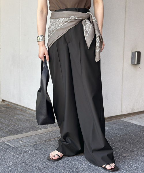 オンオフ両用で長いシーズン着用できるライトT/Rワイドパンツに新色ブラックが登場! 落ち感のあるさらっとした肌触りの良い生地で軽い穿き心地で長いシーズン着用が可能。 少し腰で落として穿いていただくボトムスで、ワイドでゆったりしたサイズ感なのにヒップや腰回りがすっきり見えるのが特徴です。 定番ブラックは合わせやすく、様々なシーンで着用いただけます。 ********************* 透け感:なし 裏地:なし 伸縮性:なし 光沢感:ややあり 生地の厚さ:普通 ********************* ※照明の関係により、実際よりも色味が違って見える場合があります。 またパソコン・スマートフォンなどの環境により、若干製品と画像のカラーが異なる場合もございます。 ※商品の色味は、商品アップ画像をご参照ください。 モデルサイズ:H162 着用サイズ:38 本体:手洗い可能