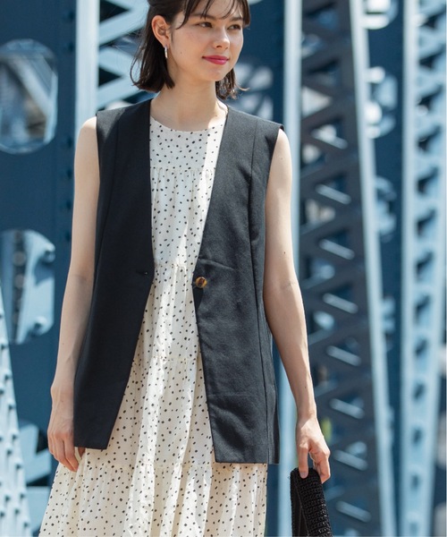 着こなしのメインにおすすめのVネックジレ【デザイン】・ベーシックなノーカラーVネックジレ。・ヒップが隠れる長めの着丈で設定しています。・ウエストラインを絞り過ぎず、着る方のシルエットになじむこだわりのパターン設計。・タンクトップやTシャツ合わせでラフな着こなしもおすすめです。・オンタイムには、ブラウスなどの合わせできれいめな着こなしも可能。・パンツ合わせはもちろんですが、長めのナロースカートなど上品な着こなしもおすすめです。※ポケット数:横×2【素材】・清涼感のあるコットン/ポリエステル素材。・お洗濯可能な素材でお手入れも簡単。※裏地なし※照明の関係により、実際よりも色味が違って見える場合があります。また、パソコン・スマートフォンなどの環境により、若干製品と画像のカラーが異なる場合もございます。モデル情報:身長162cm B80 W62 H87 着用サイズ:38(M)店舗へのお問い合わせ商品番号:637-49003●製品寸法:38(M):着丈68cm B98cm 肩幅38cm40(L):着丈70cm B101cm 肩幅39cm42(LL):着丈70cm B104cm 肩幅40cm備考:重量:サンプルサイズ約210g