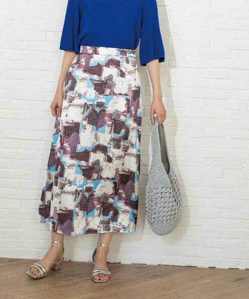 オリジナル幾何柄が目を惹くサテンナローフレアスカート【デザイン】・トレンドのサテン素材に、オリジナル幾何プリントを施したナローフレアスカート。・腰周りはすっきりさせ、裾に向けて自然と広がるナローフレアシルエット。・後ろ部分はゴム仕様にし、フィット感もありながら楽な穿き心地に。・インパクトのある柄でスタイリングのポイントにおすすめです。※左脇ファスナー開き※ポケットなし【素材】・上品な光沢感のあるサテン素材を使用。・オリジナルの幾何プリントも魅力。・マシンウォッシャブルでご自宅でのお洗濯も可能。※裏地なし※こちらの商品はやや透け感があるため、インナーの着用をおすすめします。※照明の関係により、実際よりも色味が違って見える場合があります。また、パソコン・スマートフォンなどの環境により、若干製品と画像のカラーが異なる場合もございます。モデル情報:身長162cm B80 W62 H87 着用サイズ:38(M)店舗へのお問い合わせ商品番号:637-79001●製品寸法:38(M):総丈88cm W69cm H97cm40(L):総丈90cm W72cm H100cm42(LL):総丈90cm W75cm H103cm備考: