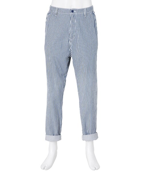 中肉のデニム素材を使用したデニムパンツ。ベーシックなシルエットに、ヒッコリー柄がポイント。この製品は独特な風合いを出すため、製品加工を行っております。1点ごとにサイズや風合い等、特徴が異なりますのでご了承ください。Torso:H180 C87 W78 H86 着用サイズ:03サイズ