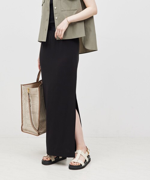 【素材】 美しいドレープの出るトリアセテートジャージー。ジャージーなので伸縮性がありコンフォートな着心地ですがエレガントでキレイ目な印象の素材です。ひんやりとしたタッチ、しわになりづらく持ち運びにも便利で速乾性もあるイージーケアが嬉しいポイント。 【デザイン・シルエット】 女性らしさを引き立てるシンプルで飽きのこないペンシルスカート。ウエストは光沢のあるゴムベルトでフィット感がありながら、表に見えても洗練されたデザイン性を持たせています。裏地付きなのでボディラインを拾いすぎず安心感があります。長めのスリットで足さばきが良くセンシュアルな雰囲気。 【カラー】 ピーコックグリーン、黒の2色展開 【おすすめのスタイリング】 同シリーズのプルオーバーと一緒に着ていただくとワンピースのように見え、普段着からオケージョンまで対応でき、オススメです。シンプルなので色々なテイストのトップスとスタイリングが楽しめます。足元はフラットでヌーディなサンダルが好相性。 ---------------------------- 透け感:なし 裏地:あり 伸縮性:あり 光沢感:なし 生地の厚さ:薄手 ポケット:なし 開き方:ゴム ---------------------------- 【モデル情報】 モデル身長:168cm 着用サイズ:38 【トリアセジャージーシリーズ】 バックオープンワンピース(品番:GGE24580) レイヤードプルオーバー(品番:GGM24570) ペンシルスカート(品番:GGC24570) パンツ(品番:GGS24570) の4種類がございます。 ※画像の商品はサンプルです。実際の商品と仕様、加工、サイズが異なる場合がございます。 ※撮影場所やライティング、お使いのモニター環境によって色の見え方が異なる場合がございます。 ※商品のカラーは画像の色味をご参照ください。動画は仕様説明のため、色味が実物と異なる場合がございます。
