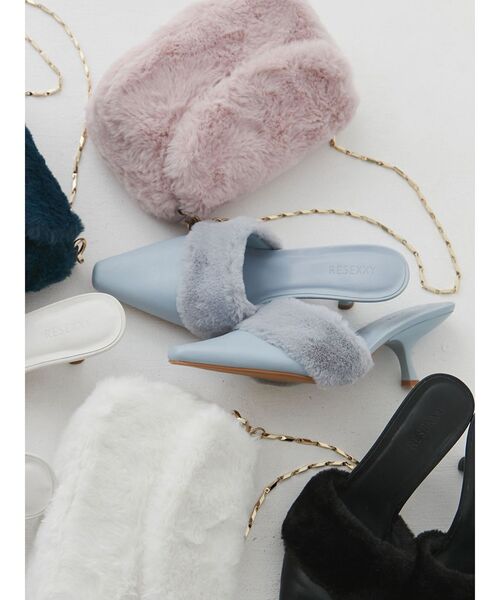 シーズンムードを高めるファー付きミュール▽デザイン▽ポインテッドトゥが女性らしい1足。履き口部分には毛並みの良い同色のファーを付けトレンド感あるミュールに仕上げました♪ヒールはローヒールで安定感があり履きやすいのがポイント◎▽カラー▽白・黒・青の3色展開。