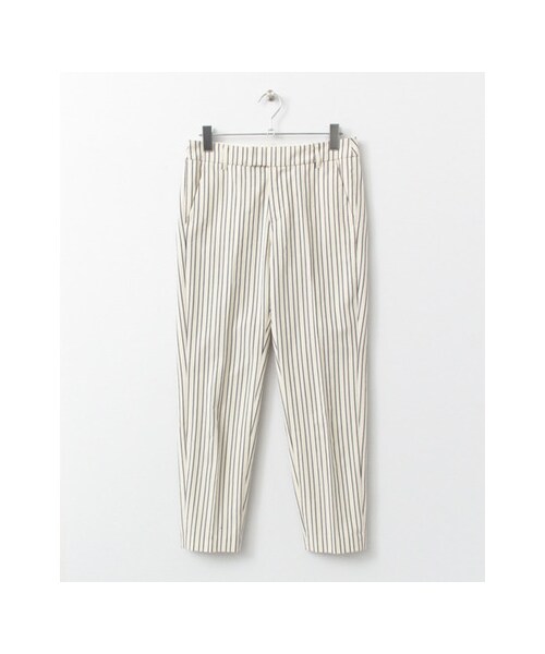スッキリとしたシルエットが美しく、ストライプと上品なネイビーが合いまったテーパードパンツが登場。ヘリンボーン組織で変化を付けた雰囲気のあるオリジナルドビーストライプの生地を使用しました。シャツやヒールに合わせればお仕事着に、Tシャツやサンダルに合わせればカジュアルに、幅広くオンオフ問わず活躍するアイテムです。※詳しい洗濯方法については、商品の品質表示タグをご覧ください