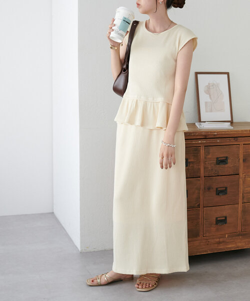 DISCOAT ONLINE LIMITED ITEM ペプラムデザインが特徴の着回し万能のセットアイテム♪ ●デザイン ペプラムトップスとIラインのナロースカートで女性らしいシルエットのセットアイテム♪ ワッフル素材なのでキレイめになりすぎずにカジュアルに着こなせます。 スカートはウエスト総ゴムで着脱しやすく着心地も抜群◎ シンプルなデザインで別々にも着用できるので着回しも万能な優秀アイテムです! ●素材 伸縮性のあるワッフル素材を使用しております。 ●スタイリング トップスはデニムやキレイめなスラックスなどに合わせるのもおすすめ♪ すっきりとしたノースリーブなのでインナー使いにも◎ ナロースカートはシンプルなのでトップスを選ばず幅広いスタイリングが可能です。 ●STAFF着用コメント 158㎝スタッフ(Fサイズ着用):ナロースカートは腰回りが気になりますがペプラムトップスと合わせることでカバーできメリハリのあるシルエットになるのがお気に入りです♪ *********************** 洗濯方法:手洗い可能 裏地:なし 透け感:アイボリーのみややあり 伸縮性:あり 光沢感:なし 生地の厚さ:普通 ***********************