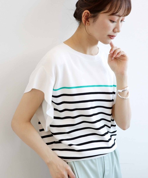ラッフルスリーブニットさらっとした風合いが涼しく、夏の時期にぴったりなニットプルオーバー。お袖のラッフルフリルは腕回りをさりげなくカバー。美しく見せるボートネックが上品なデザインです。脇からのチラみえが防止できるマチ付き。程よい肉感で透け感が少なく、インナーを選ばず着られるのも嬉しい◎※脇見え防止※※接触冷感※--------------------------------------透け感:なし裏地:なし伸縮性:ややありケア方法:手洗い可※お洗濯の際は洗濯表示を必ずご確認ください。--------------------------------------