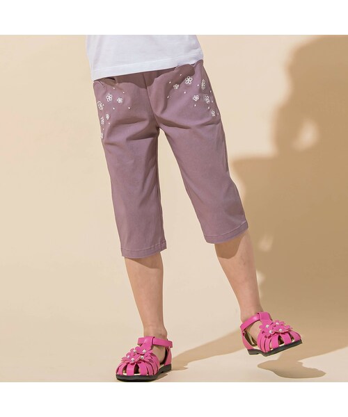 フラワーシャワーのように散りばめたお花の刺しゅうがかわいい6分丈パンツ 丸みのあるスカラップのポケット口も可愛らしくトップスをINしてもオシャレです。 上品な印象で着られる裾に向かって細身になる6分丈のデザイン。 細身のシルエットでコーディネートをすっきりとまとめてくれます。 爽やかなブルーとおしゃれなグレイッシュモーブ(パープル)の2色展開。 落ち着いた色合いが初秋まで使いやすいカラーです。 伸びの良いストレッチウェザー素材を使用した快適なボトムです。 【BeBe(べべ)】 ”LOVE MODERN” 少しおませで、生意気なヨーロピアンカジュアルの提案。 時代性・流行性をとらえ、ベーシックでもワンポイントを施した遊び心、楽しさを盛り込んでいます。 シンプルだけど、こだわりのあるオリジナリティーを重視しています。