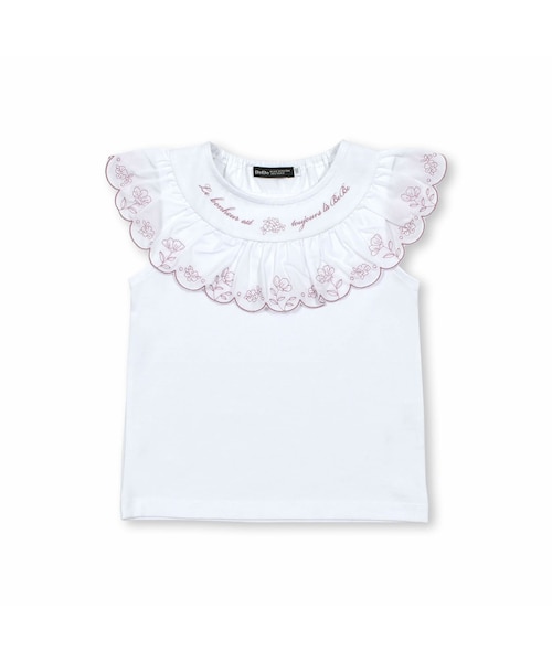 ボリューム感のあるお花刺しゅうのフリルが華やかな印象のノースリーブTシャツ。 まぁるいスカラップの縁が顔周りを華やかに見せてくれます。 フリルの刺しゅうと同じ色のロゴ刺しゅうをデコルテ部分に入れてまとまりのあるデザインに。 身ごろはすっきりとしたシルエットなのでスカートやキュロットなどボリュームのあるボトムとも相性◎ 首ぐりの背中部分はゴムが入っているのでお着替えがラクチンなのもうれしいポイント。 ネイビーにはホワイトの刺しゅう、ホワイトにはピンクの刺しゅう入り。 合わせやすく万能に使える夏のおすすめトップスです。 天竺の身ごろとブロード綿のフリルの切り替えでTシャツながらもきちんと見えする1着です。 【BeBe(べべ)】 ”LOVE MODERN” 少しおませで、生意気なヨーロピアンカジュアルの提案。 時代性・流行性をとらえ、ベーシックでもワンポイントを施した遊び心、楽しさを盛り込んでいます。 シンプルだけど、こだわりのあるオリジナリティーを重視しています。