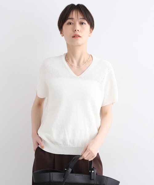 【デザインポイント】 接ぎのない無縫製手法で編み上げた抜け衿タイプのニットトップスです。 アシンメトリーに施した編地切替がポイント。 和紙の糸を使用することでとても軽く、ドライなタッチで涼しく着用いただけます。 二の腕が隠れる程度のフレンチスリーブで着るだけでこなれた抜け感あるシルエットに拘りました。 オーバーサイズ過ぎずキレイ目な印象で着用いただけるサイジングです。 【スタイリングポイント】 夏の映える一枚着トップスとしてボトムを選ばず合わせていただけます。 特にワイドボトム合わせがおすすめ。 艶感のあるサテンのワイドパンツで大人の夏の鵜イージーコーデが完成します。 シャツなどの羽織のインナーにも活躍します。 キャミワンピースなどのインナーではなく、アイテムの上からトップスとして合わせるのもスタイルのバリエーションが広がりおすすめです。 【素材ポイント】 和紙を使用したドライなタッチのペーパーライクな糸を使用しています。 着心地は紙のようにとても軽く、ドライな肌触りはこれからの猛暑を涼しく過ごせる素材感です。 ※照明の関係により、実際よりも色味が違って見える場合があります。また、パソコン・スマートフォンなどの環境により、若干製品と画像のカラーが異なる場合もございます。 【生地詳細】 透け感:ややあり 伸縮性:あり 生地の厚み:普通 裏地:なし 洗濯方法:手洗い可 モデル情報:身長168cm B74 W58 H84 着用サイズ:38(M) 店舗へのお問い合わせ商品番号:127-19404 ●製品寸法: 05(XXS):着丈58cm B98cm 肩幅54cm 13(LL):着丈65cm B118cm 肩幅68cm 15(3L):着丈66cm B124cm 肩幅71cm 19(5L):着丈68cm B132cm 肩幅74cm 34(S):着丈62cm B106cm 肩幅66cm 38(M):着丈63cm B110cm 肩幅66cm 備考: