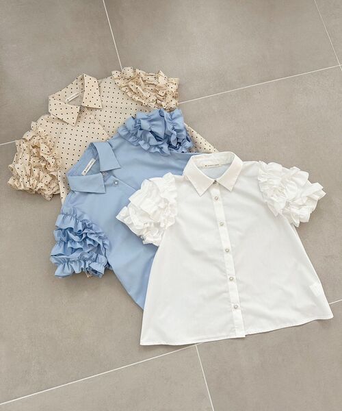 ミルフィーユのように重なりあったフリルが目を惹く、スイートなシャツブラウスが登場 ■デザイン ボリュームたっぷりのフリルがポイントになったシーズンムード満載なシャツブラウス。 シャツ襟にすることで、甘すぎない大人の魅力をプラス。 さりげなく輝くビジューボタンもポイントになっています◎ 着るだけでスタイリングが華やぐ、主役級の一枚です。 ■サイズ感 タックインできる安心感のある丈感。 袖口にはゴムが入っています。 ■スタイリング デザイン性のあるアイテムなのでシンプルコーデでもトレンドスタイルに◎ デニムパンツや、ミニボトムを合わせたガーリースタイルがおすすめです。 ・・・・・・・・・・・・・・・・・・・・・・ 透け感:ややあり(オフ) 裏地:なし 伸縮性:あり(袖口部分) 光沢感:なし 生地の厚さ:普通 ・・・・・・・・・・・・・・・・・・・・・・ ■商品のお気に入り登録 再入荷通知やのこりわずか、お得なプライスダウンの情報も受け取ることができます。 ぜひご登録ください◎ ※サンプルでの撮影の為、製品と仕様が異なる場合がございます。