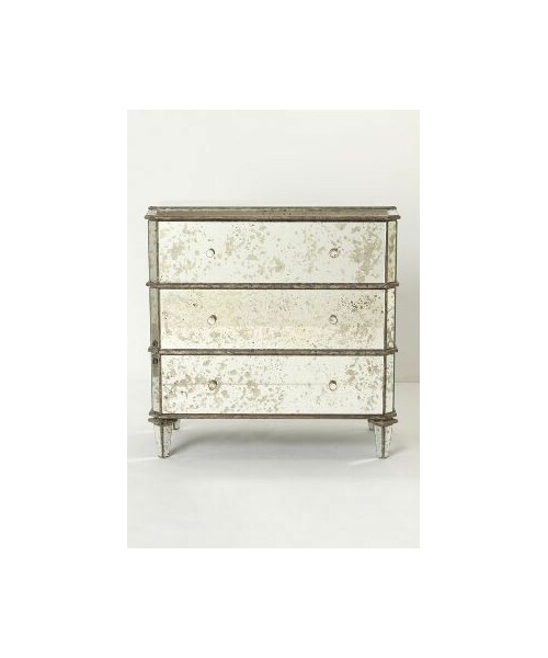 No two are exactly alike. Hardwood frame, engineered hardwood, metal drawer glides, antiqued silver mirror, lacquer, silver leaf. Imported. Overall: 32"H, 32"W, 17"D. Drawers: 8"D