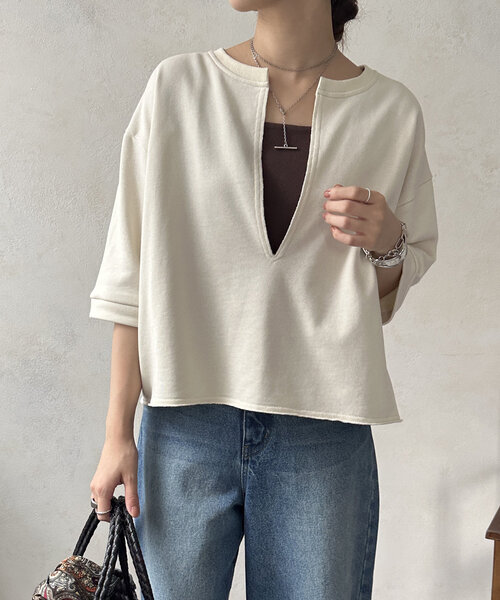 ■2024 SPRING & SUMMER ITEM■ ざっくりと入ったネックのカットがおしゃれ見え! ネックラインにデザインを加えておしゃれに仕上げた1着。 ざっくりとしたカットを施し、顔回りをすっきりと、そしておしゃれな印象に仕上げます。 そして、すっきりと決まる程よい丈感はボトムインせずともバランスよくマッチ。 裾は切りっぱなしたようなデザインで抜け感をプラスしてくれますよ。 二の腕もしっかりとかカバーしてくれる5分袖は、これからの季節にうれしいポイント! - POINT - ・ラフな印象に仕上がる! ・ネックラインのカットがポイント ・ボトムインせずともすっきりと決まる丈感 -------------------------------- 洗濯:手洗い可能 透け感: ほとんどなし 裏地: なし 伸縮性: あり 光沢感: なし -------------------------------- 【 ♡ をクリックでお得な情報をお知らせいたします 】 〈 商品のお気に入り登録 〉 お気に入りアイテムのお値下げ・再入荷・在庫ラスト1点など通知を受けることができます。 〈 ブランドのお気に入り登録 〉 DOUDOUの新商品や再入荷、セール、クーポン配布などお得な情報を受けることができます。 -------------------------------------- ※ 生産の都合上、お届け時期が前後する場合がございます。 ※ 掲載画像の商品の色味は、 撮影場所や光の当たり具合などにより色味が異なって見える場合がございます。 また、お客様のお使いのPC・スマートフォン等のモニター環境などにより色味が異なって見える場合がございます。予めご了承の上ご注文ください。 ※ 着用、お取り扱いの際は、商品についている品質表示とアテンションタグを必ずご確認下さい。