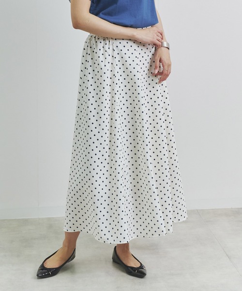 《ディテール》ドット柄がフェミニンな印象。ウエストはファスナータイプ。しっかり裏地が付いているのが嬉しいポイント。《ファブリック》軽やかなシフォン素材のマーメイドスカート。《スタイリング》インナーをINしても綺麗に着こなせます。程よい着丈なのでヒールはもちろんフラットシューズやスニーカーと合わせても◎