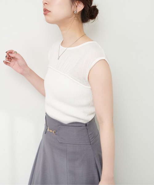 【2024SS natural couture】 1枚でレイヤードスタイルが完成する大人ニット ■Design 胸元のシアーの切り替えがアクセントになったサマーニット。 まるでビスチェを着用しているかのような デザインでトレンドライクな仕上がりに。 清涼感のある生地感と程よい透け感が スタイリングに抜け感をプラスしてくれます。 伸縮性のあるリブ素材がウエストを ナチュラルに引き締めスタイルアップ◎ これからの季節長くお使いいただける、 パンツにもスカートにも合わせやすい万能アイテムです。 ■Styling インナーにキャミソールやバンドゥを合わせて、 さらっと透け感を楽しんでいただくのがおすすめ。 上品なスカート合わせはもちろん デニムと合わせてカジュアルな着こなしも◎。 ■Fabric 伸縮性のある通気性に優れた素材。 しわになりにくくお手入れも簡単です。 ======================= 洗濯方法:手洗い 透け感:ややあり 裏地:なし 伸縮性:あり 光沢感:なし 生地感:やわらかく伸縮性のある生地 ======================= ※着用、お取り扱いの際は、商品に付いている品質表示とアテンションタグを必ずご確認ください。 【お気に入り登録でお得な情報がいっぱい】 ・「商品のお気に入り登録」で再入荷通知や、ラスト1点の通知、セール通知をいち早く受け取ることができます。 ・「ブランドのお気に入り登録」で新商品や再入荷など、お得な情報を受け取ることができます! ※店舗の入荷時期は商品によって異なります。 店頭の在庫状況につきましては各店舗にてお問い合わせください。 ※撮影時の光の関係で、画面上の画像と実際のお色とでは若干の色差が生じる可能性がございます。 また、ご覧いただいているモニター画面や、お使いのブラウザによっても、お色の違いがございますことをあらかじめご了承くださいませ。