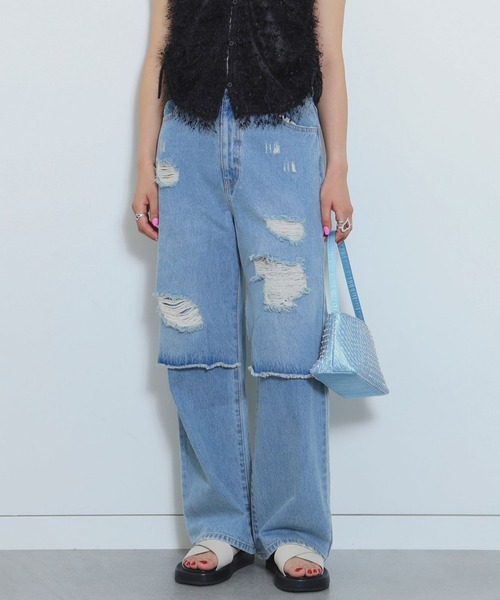 1枚で旬なスタイルに■デザイン〈Ray BEAMS(レイビームス)〉らしいレイヤード風のデザインに大胆なダメージ加工を施したオリジナルのデニムパンツ。ダメージ部分からは肌が見えない仕様になっているため、トレンド感のあるダメージデザインにも挑戦しやすく、ロングシーズン活躍する1枚です。■コーディネート存在感のあるデザインのため、シンプルなシャツやスウェットなど幅広いカジュアルスタイルにマッチします。■サイズワイドストレートシルエット。■素材やや厚みのある素材感。■ケア方法洗濯可(詳細は商品についている洗濯表示タグをご覧ください。)【BLACK】BEAMS STAFF:H168 Size:1【BLUE】BEAMS STAFF:H160 Size:1※光の当たり具合やパソコンなど?の閲覧環境によって、実際の色味と異なって見える場合がございます。予めご了承ください。※商品の色味は商品単体で撮影した画像をご参照ください。※画像の商品はサンプルのため、実際の商品と「仕様」「色味」が異なる場合がございます。