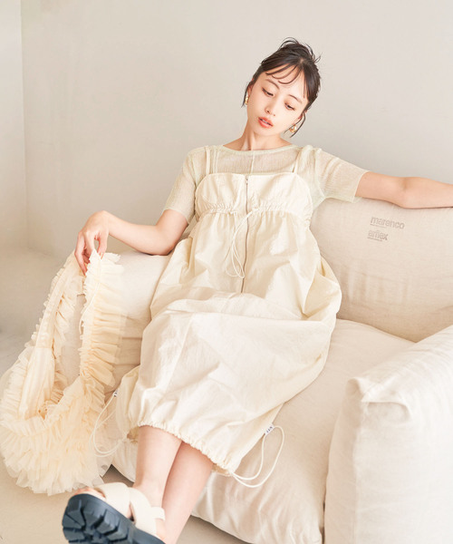 ◆2024春夏◆【デザイン・シルエット】 LOTTOコラボのナイロンキャミワンピース。 <POINT>・今年トレンドのカップディテールと裾ドロストによるバルーンシルエットのキャミワンピース。・胸元は背中部分のゴム使用で楽ちんな着心地。・フロントファスナーはあえてファスナーの歯の部分を見せるムシ見せ仕様にし、デザインポイントに。・左ポケット下のLOTTOロゴはぷっくり立体プリントにしています。・裏地背中部分にLottoのパイピングあり。 【素材】ツヤ感とシワ感のある薄めのナイロン素材。裏地はメッシュのため、通気性が良いです。 【カラー】アイボリー、チャコールとくすみグリーンの3色展開。 【おすすめのスタイリング】ワンピースにスポーティ感があるのでインナーは女子っぽい要素を取り入れてスタイリングするとオシャレ度UP!シアーのニットインナーと重ねるスタイリングがおすすめ。ショート丈の羽織ともバランスが取りやすいです。〈LOTTO/ロット〉ロットはサッカーシューズに特化したシューズメーカーとして、イタリアで創業。世界で初めて、紐なしのスパイクシューズを開発するや「飽くなき機能の探求とデザイン改革」を掲げるロットの企業ポリシーが全世界に証明された。ブランドマークの“ダブルダイヤモンド”は最高峰の証として広く認知されている。近年ではサッカー、テニスなどのスポーツ分野にとどまらず、カジュアルライフスタイルの分野にもビジネス領域を広げ、世界戦略を強めている。〈コラボ商品品番〉BVS74200 BVE74200BVM74200 ----------------------------- 裏地:あり(メッシュ生地) 光沢感:あり 透け感:なし 伸縮性:なし ファスナー:フロントにあり ポケット:あり 生地の厚さ:薄手 肩紐:調整可 その他仕様:胸下の絞りはドロスト仕様で調整可能、後ろはゴムあり 季節:春、夏、秋 ----------------------------- 【モデル着用サイズ】 全色モデル身長:160cm、着用サイズ:F せいらさん身長:171cm 、着用サイズ:F ※画像の商品はサンプルです。 実際の商品と仕様、加工、サイズが若干異なる場合がございます。 ※重量はサンプルFサイズの測量になります。サイズによって多少異なる場合があります。 ※画像によっては実際の色味と異なる場合があります。正しい色味は生地アップ画像をご確認ください。