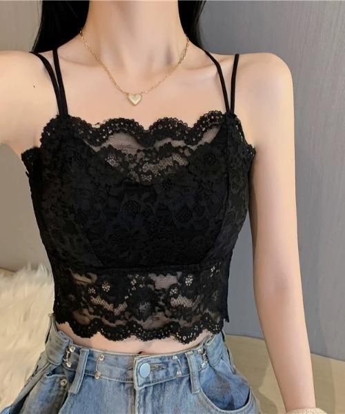 【合計販売数8,000枚突破!】【お気に入り登録数25,000人突破!】レースの存在感で、いつものコーデがが一気に今っぽく♪1枚でトップス使いも、インナー仕込みもどっちも得意。胸元はスカラップレースで抜け感をプラス。背中はクロスストラップで、後ろ姿までポイントに◎ブラック/ホワイトの2色で、甘さもモードも振れます。【POINT】◎カップ付きで着用しやすいレースキャミ◎ダブルストラップが肩まわりのアクセントに◎胸元スカラップ×裾レースで映えるデザイン◎背中クロスストラップでバックスタイルまで可愛い◎デニム・カーゴ・スウェットまで幅広くハマる【DETAIL】・レースデザイン・カップ付き仕様・ダブルストラップ・バッククロスデザイン・ショート丈/クロップドバランス【おすすめコーデ】① レースキャミ+ワイドデニム+シャツ羽織→ 王道の海外ガールっぽレイヤードに♪② レースキャミ+カーゴパンツ+ショートブルゾン→ 甘さ×ストリートのミックスが可愛い◎③ レースキャミ+スウェットパンツ+スニーカー→ ラフなのにちゃんとトレンド感。④ レースキャミ+ミニスカ+ロングブーツ→ 夜映えするY2Kムードで盛れる!モデル身長…157cmモデル着用サイズ…M伸縮性…あり裏地…カップ部分のみあり透け感…あり/ 12411079※輸送時による多少の汚れ・シワがある場合がございます。※撮影時のライティング、ご覧になっているモニターやPC環境などにより、実際の商品と色味が異なって見える場合がございます。※サイズは全て平面置きで採寸したものです。商品の性質上、多少の個体差がございます。ご了承の上お買い求め下さい。【商品のお気に入り登録】人気商品の再入荷やプライスダウン等の通知を受け取ることが出来ます♪【ブランドのお気に入り登録】新商品の入荷やお得な情報などを受け取ることが出来ます♪是非ご登録下さい☆春服 夏服 秋服 春服コーデ 夏服コーデ カップ付きキャミソール レースキャミ ブラトップ ダブルストラップ クロスストラップ スカラップレース クロップド丈 ショート丈 インナー レイヤード 重ね着 韓国ファッション Y2K 海外ガール ストリート モード デニムコーデ 春服 夏服 秋服