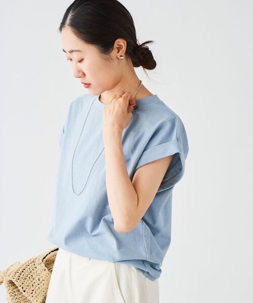 袖をロールアップしたようなデザインがポイントのTシャツ。シャリ感のあるドライタッチな素材を使用し、汗をかく時期にもピッタリのアイテムです。後ろが少しコクーンシルエットで丸みが出るので、バックスタイルも可愛い形になっています。●ポイントロールアップデザインが肩をカバーしてくれるのも嬉しいポイントです。●おすすめコーデスカートでもパンツでも合わせやすく、麻ジャケットのインナーとしても◎1枚持っていると万能な一着になっています。カジュアルすぎないシンプルなデザインなので、きれい目にも合わせて頂けます。3043019702と同素材になります。
