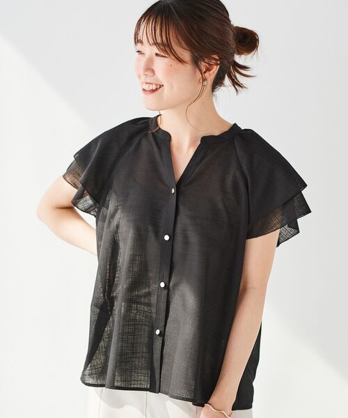 程よい透け感のあるスラブ素材を使用したブラウス。 リネンライクな表情のあるスラブ生地が夏らしい一枚。 ●ポイント スッキリとしたVネックと腕をすっきり見せてくれる、袖のほんのりラッフルディテールがポイント。 適度な甘さで大人可愛いデザインに。ご自宅でのお手入れ可能な点も◎ ●おすすめコーデ スカートにはインして着用するのがおすすめ。 パンツにも合わせやすい着丈で、細身のパンツにインせず着てもおすすめです。