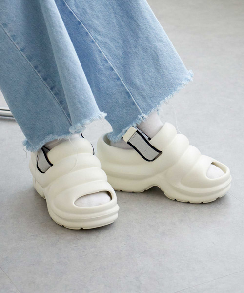 ぷっくりフォルムと軽量な履き心地がうれしいマシュマロサンダル。ライン入りのストラップを付けた、スポーティーな見た目のデザインです。【素材】ふわっと軽いEVA素材。【デザイン】ボリュームのある厚底タイプでスタイルアップ効果も!素足ではもちろん、靴下合わせもおすすめです。【おすすめコーディネート】ワイドパンツやフレアスカートなど、ボリュームのあるボトムにも負けない存在感!韓国ストリートな着こなしにもマッチします。*靴裏の表記は木型のサイズとなります。★Instagramにて近日発売予定のアイテムやルックをご紹介しております。@vence_sharestyle★《お気に入り登録》でお得な情報がいっぱい★・「商品のお気に入り登録」で再入荷通知や、ラスト1点の通知、セール通知も受け取ることができます。・「ブランドのお気に入り登録」で新商品や再入荷など、お得な情報を受け取ることができます!※商品の色味は、撮影場所や光のあたり具合などにより色味が違って見える場合がございます。また、お客様のお使いのモニター環境などにより色味が違って見える場合がございます。予めご了承の上ご注文下さい。※他のキャンペーンにより、期間中に価格が変動する場合があります。※セールは予告なく終了させていただく場合もあります。