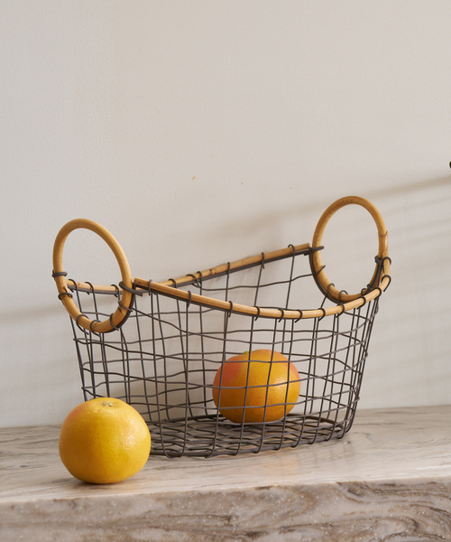 インテリアにもなるお洒落なバスケット 無機質なワイヤーと温かみを感じるラタンの異素材を組み合わせたバスケット。 ランダムに張られたワイヤーが表情豊で、フチと持ち手のラタンが優しい印象に。 キッチンやリビングなど様々な場所に馴染む落ち着いたデザインです。 かごは通気性がよいので、機能面でもおすすめ。 無造作にものを入れるだけでお洒落に見える、おしゃれなバスケットです。 収納スペースが少ないお部屋の「見せる収納」としてピッタリ。 ※ATTENTION※ 素材の飛び出しによる引っかかりが生じる場合がございますので、収納物によっては布などを敷いてご使用下さい。 天然素材、手作り品のためサイズに若干の誤差が生じる場合がございます。
